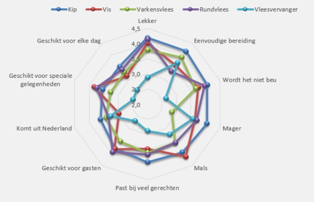 Dat zo veel mensen kiezen voor kip heeft te maken met het goede imago van kip. In vergelijking met veel andere vleessoorten, vis en vleesvervangers scoort kip bijvoorbeeld erg goed op “het is lekker”, “eenvoudige bereiding” en “past bij veel gerechten”.