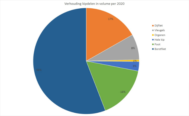 Als we dan kip eten in Nederland dan eten we het liefst borstfilet of dijfilet. Als we kijken naar de omzet (in euro) van voorverpakte kip, is kipfilet verreweg het meerendeel van de omzet in voorverpakte kip. Dat betekent dat van het vlees dat wordt geproduceerd veel kipfilet in Nederland wordt verkocht, maar dat voor de andere delen, zoals de bouten, vleugels, organen, etc. andere markten moeten worden gevonden. Deze worden dan ook veel verhandeld binnen de eigen interne markt. Ook de delen die in Nederland niet graag worden gegeten, zoals looppootjes, orgaanvlees en vleugeltips, worden ge-expoteerd naar derde landen waar dit als delicatesse op het menu staat.
