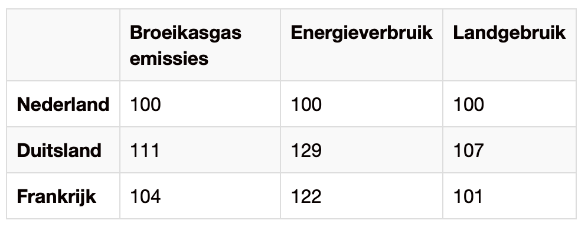 Kip is van zichzelf een dier met een lage milieu impact. De Nederlandse sector probeert dit nog verder te verbeteren en dit kun je ook zien als je het vergelijkt met een aantal andere landen, zo blijkt ook uit onderstaande tabel waarin de Nederlandse gegevens steeds als referentie (=100) zijn genomen.